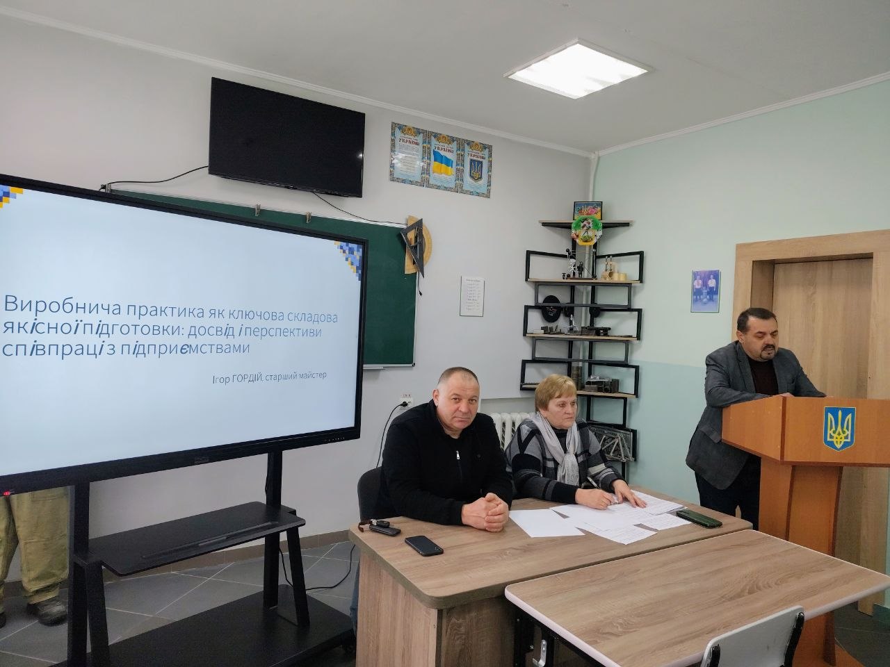 З першого питання — «Виробнича практика як ключова складова якісної підготовки: досвід і перспективи співпраці з підприємствами» — виступив старший майстер Ігор Гордій, який окреслив основні аспекти організації виробничої практики та представив напрацьований досвід співпраці з роботодавцями. Заступниця директора з навчально-виробничої роботи Леся Гаврилюк доповнила виступ, звернувши увагу на необхідність розширення партнерських зв’язків і підвищення ефективності практичної підготовки здобувачів освіти.