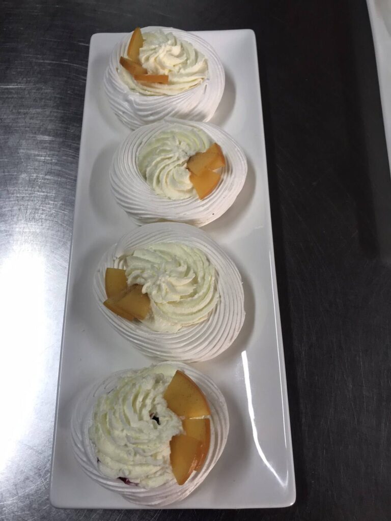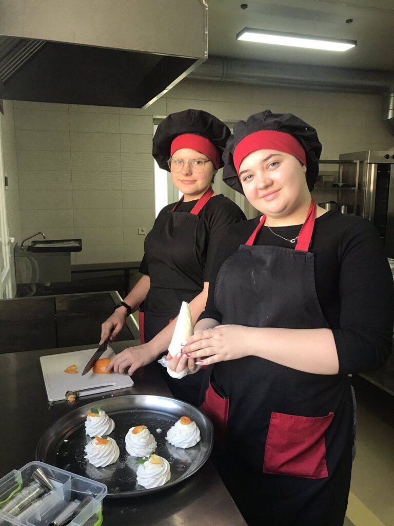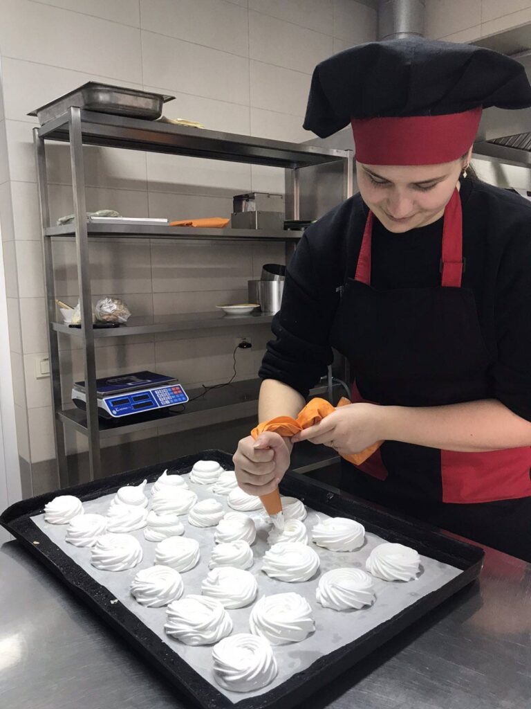 У ході заняття учасники ознайомилися з технологічними особливостями приготування білково-повітряного тіста, відпрацювали практичні навички збивання білкової маси, формування та випікання виробів. Особливу увагу було приділено дотриманню температурних режимів, техніці безпеки та сучасним підходам до оформлення готової продукції.